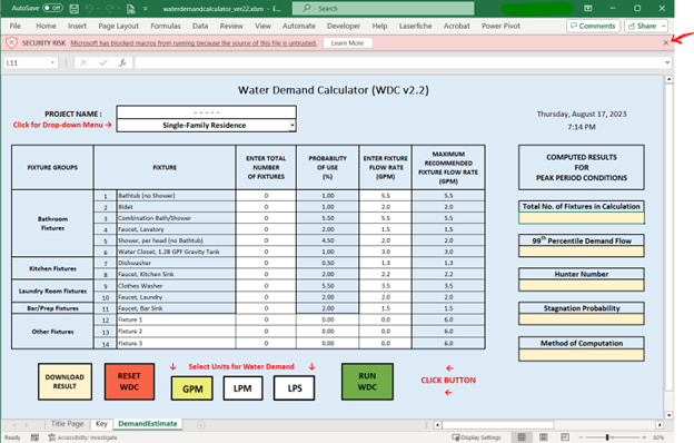 The Water Demand Calculator requires a compatible version of Excel 2009 or later to prevent loss of functionality as it uses active content (macros). For security reasons, the Microsoft Office has security features that disables the macros with a warning message. The message advises the user that active content has been detected. This does not mean that viruses have been detected. The source file comes from IAPMO, so the file can be trusted, and the macros can be enabled. Once the file is trusted, the warning will no longer appear. You may also need to check with your company's system's administrator for security permission to download a file with macros.